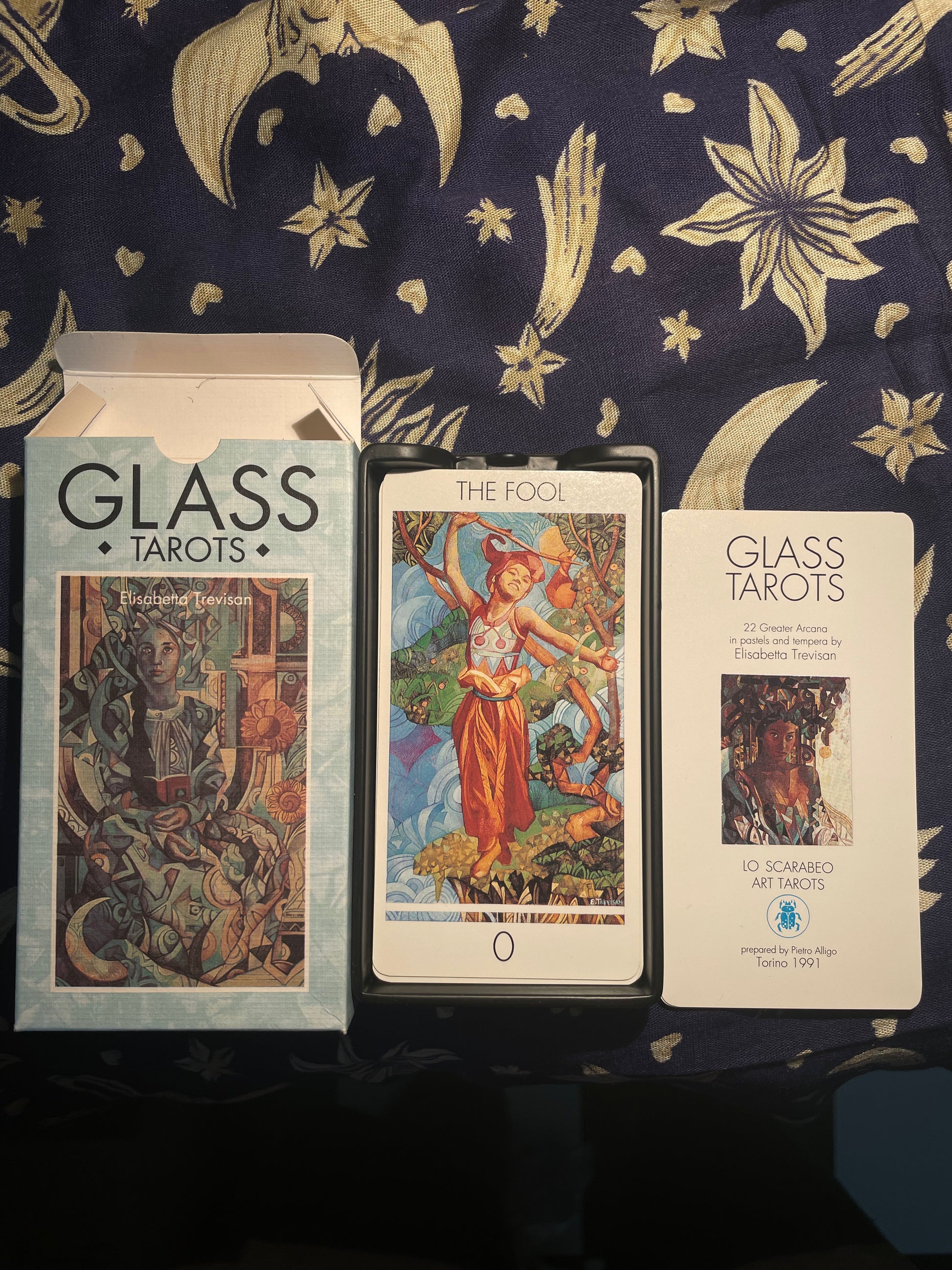 Vintage deck designed by Elisabetta Trevisan and printed in Italy. This is in mint condition and has never been used. It is from the 1990s. The Glass Tarot was created in 1991 by Elisabetta Trevisan in a limited printing from Italy of the 22 Major Arcana from what would end up being The Crystal Tarot